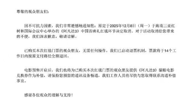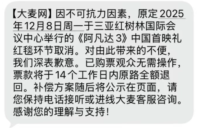 不过,有网友表示突然收到了红毯活动取消的邮件通知:“因不可抗力因素,我们非常遗憾地通知您:原定于2025年12月8日(周一)于海南三亚红树林国际会议中心举办的《阿凡达3》中国首映礼红毯环节决定取消。对于活动取消给您带来的不便,我们深表歉意,敬请谅解。”
