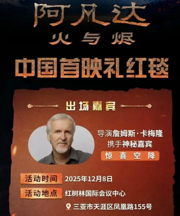 《阿凡达:火与烬》(《阿凡达3》)中国首映礼,原计划作为第七届海南岛国际电影节特别活动于12月8日在三亚举行,导演詹姆斯·卡梅隆也将惊喜现身。