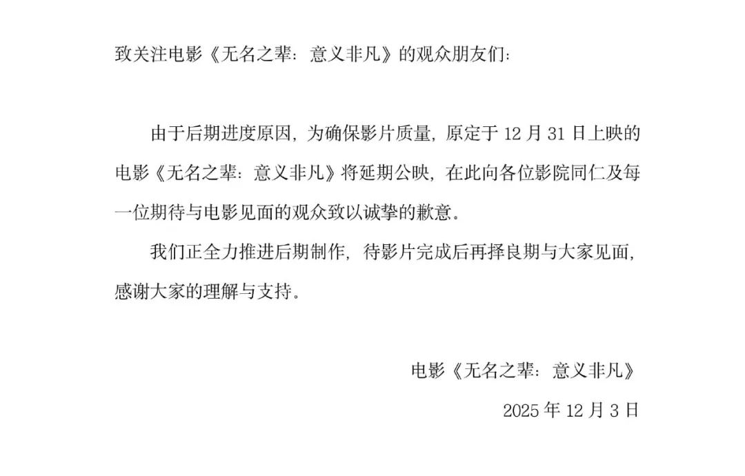 12月3日晚,@电影无名之辈 发布声明称,由于后期进度原因,为确保影片质量,原定于12月31日上映的电影《无名之辈:意义非凡》将延期公映。