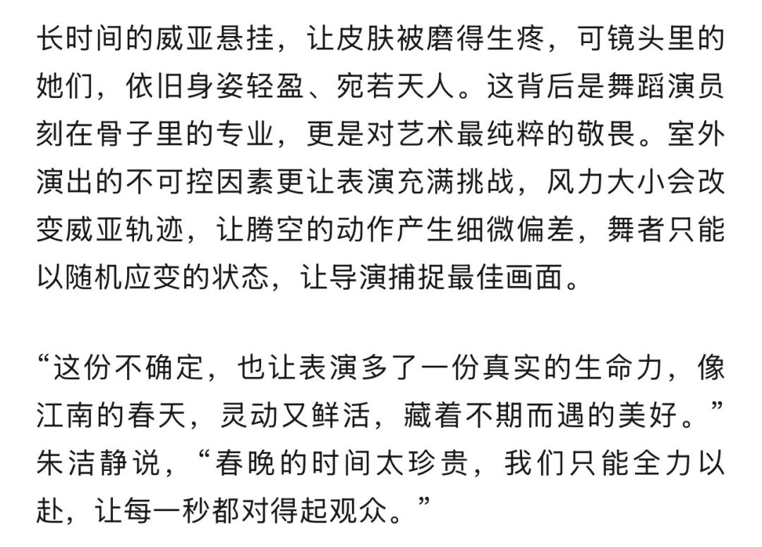 两位舞者提前两周开始在体育馆里进行威亚训练,白天在户外练习,晚上天气冷就转入室内。借助威亚进行双人配合,让难度呈几何级攀升。为了让体重、动作节奏、跑动时差达到毫厘不差的统一,体重更轻的朱洁静一侧威亚悬挂了7斤沙袋,两人如同天平两端,一丝一毫的偏差,都会直接破坏表演的平衡与美感。“我们就像义乌生产的拨浪鼓上的两个鼓槌,默契配合,才能敲出和谐的声音。”