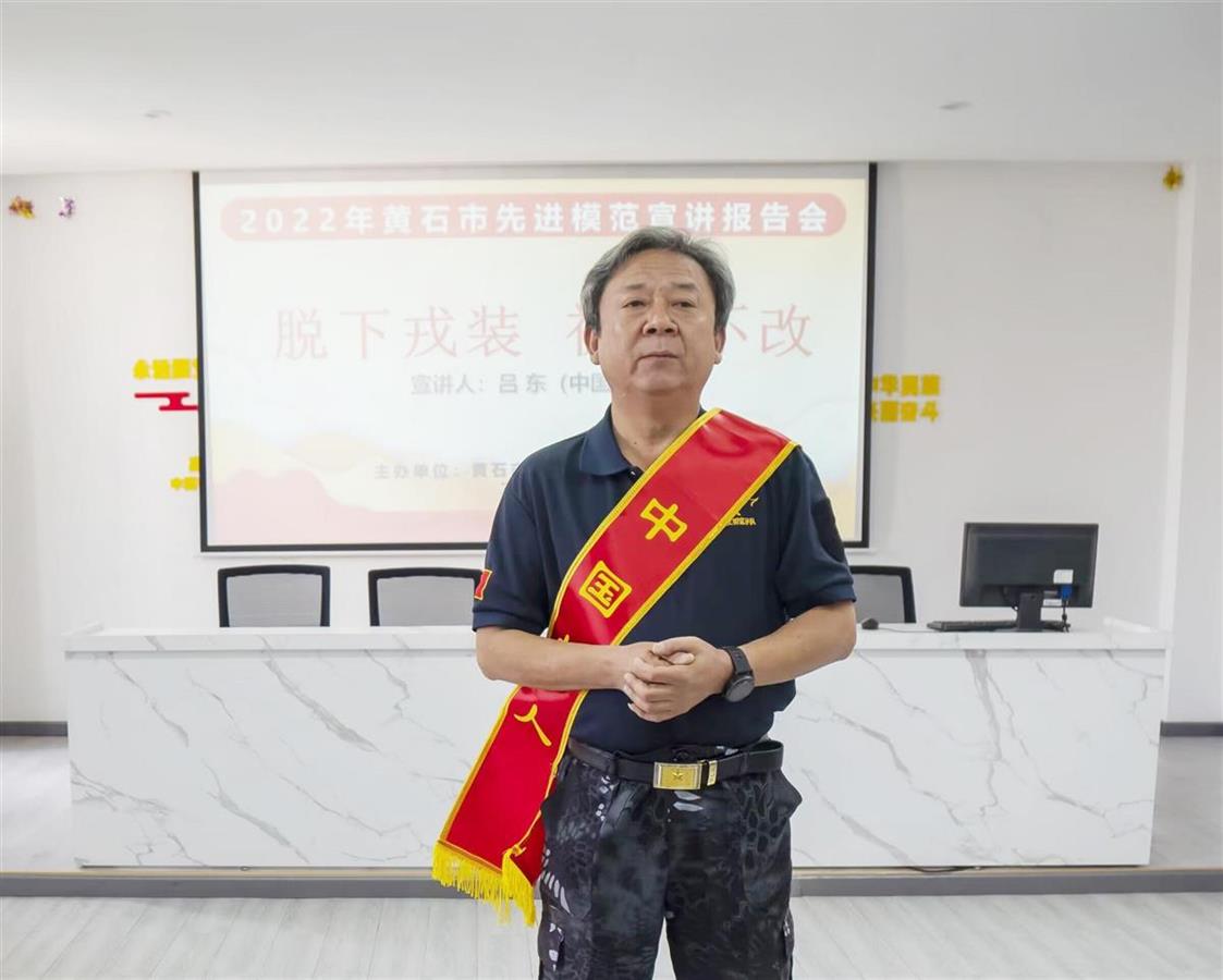 “中国好人”吕东在黄石市先进模范宣讲报告会上 通讯员供图 Lv Dong delivers a speech in Huangshi City at the “Good Samaritans of China” award ceremony (Photo provided by correspondent)