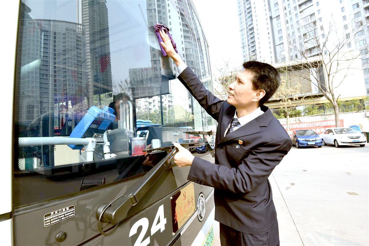 李旺富每天上班前都会清理车窗 Li Wangfu cleans bus windows every day before going to work
