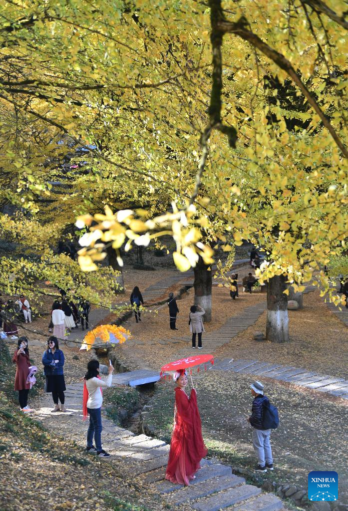 A visitor takes a selfie under a ginkgo tree in Tongziao Village, Shuangpai County, Yongzhou City, central China's Hunan Province, Nov. 23, 2025. More than 3,000 ginkgo trees here have gradually turned golden, attracting a lot of tourists. (Xinhua/Zhao Zhongzhi)