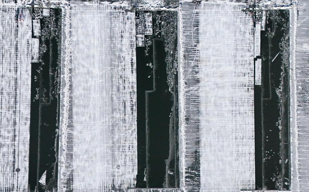 An aerial drone photo shows an ice collection area at the Harbin section of Songhua River in Harbin, northeast China's Heilongjiang Province, Dec. 9, 2025. (Xinhua/Wang Song)