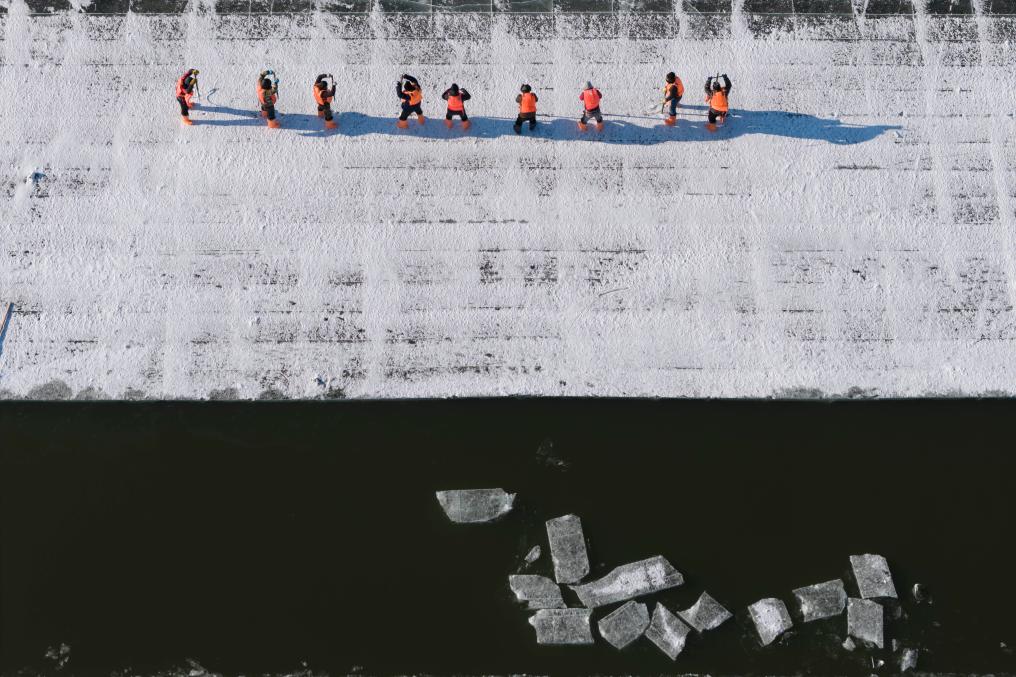 An aerial drone photo shows workers collecting ice at the Harbin section of Songhua River in Harbin, northeast China's Heilongjiang Province, Dec. 9, 2025. (Xinhua/Zhang Tao)