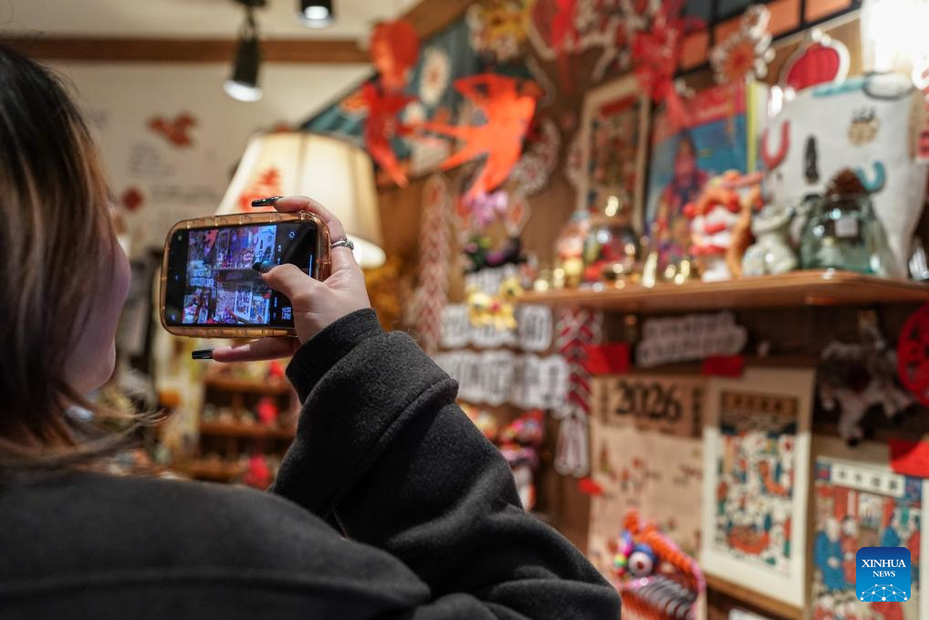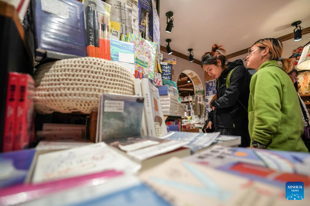 A tourist chooses cultural and creative products in a bookstore by Cuihu Lake in Kunming, southwest China's Yunnan Province, Jan. 13, 2026. Cuihu Lake is both a signature landscape of Kunming and a testament to the city's memories, surrounded by historical legacies such as the former sites of the National Southwestern Associated University and Yunnan Military Academy.