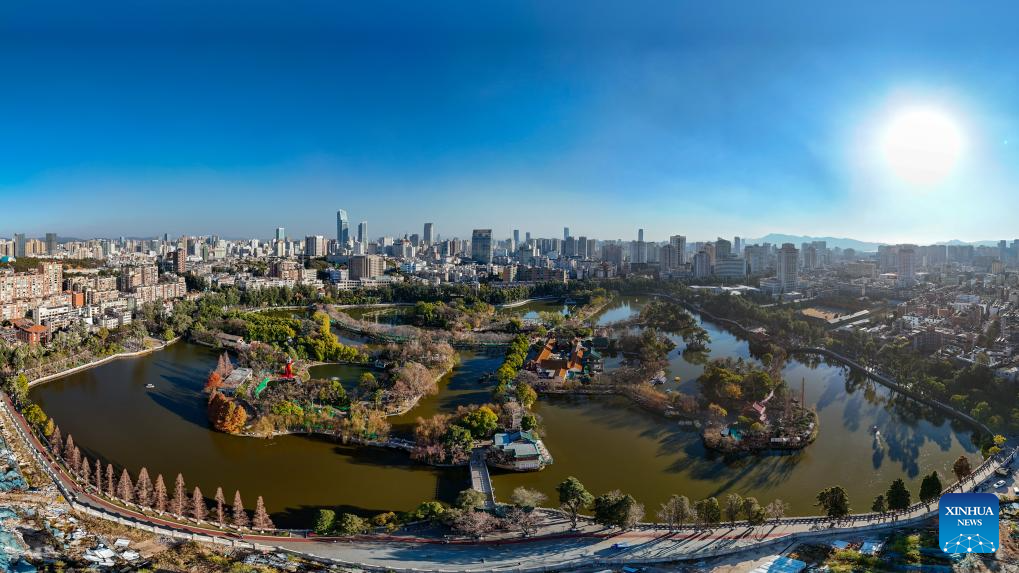 An aerial drone photo taken on Jan. 13, 2026 shows a view of Cuihu Lake in Kunming, southwest China's Yunnan Province. Cuihu Lake is both a signature landscape of Kunming and a testament to the city's memories, surrounded by historical legacies such as the former sites of the National Southwestern Associated University and Yunnan Military Academy.
