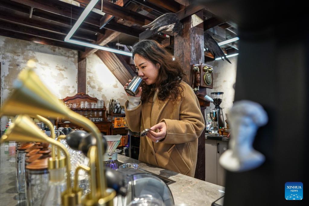 A staff member makes coffee for customers at a century-old coffee shop near Cuihu Lake in Kunming, southwest China's Yunnan Province, Jan. 13, 2026. Cuihu Lake is both a signature landscape of Kunming and a testament to the city's memories, surrounded by historical legacies such as the former sites of the National Southwestern Associated University and Yunnan Military Academy.