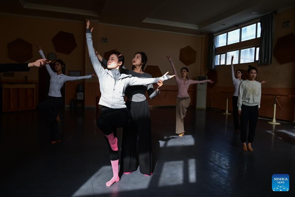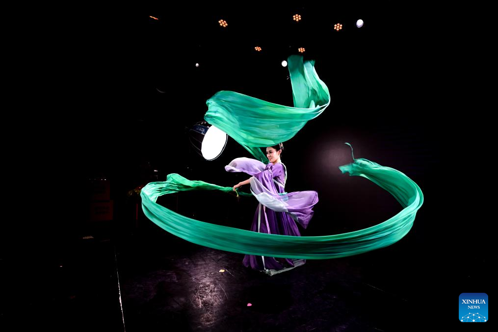 Actresses of the Shanxi Provincial Song and Dance Troupe rehearse in Xi'an, northwest China's Shanxi Province, Jan. 15, 2026. At the Shanxi Provincial Song and Dance Troupe, "group livestreaming" -- a new format featuring multi-performer live broadcasts -- is becoming a fresh approach for professional art troupes to explore an online "second stage" and promote the innovative expression of traditional culture.