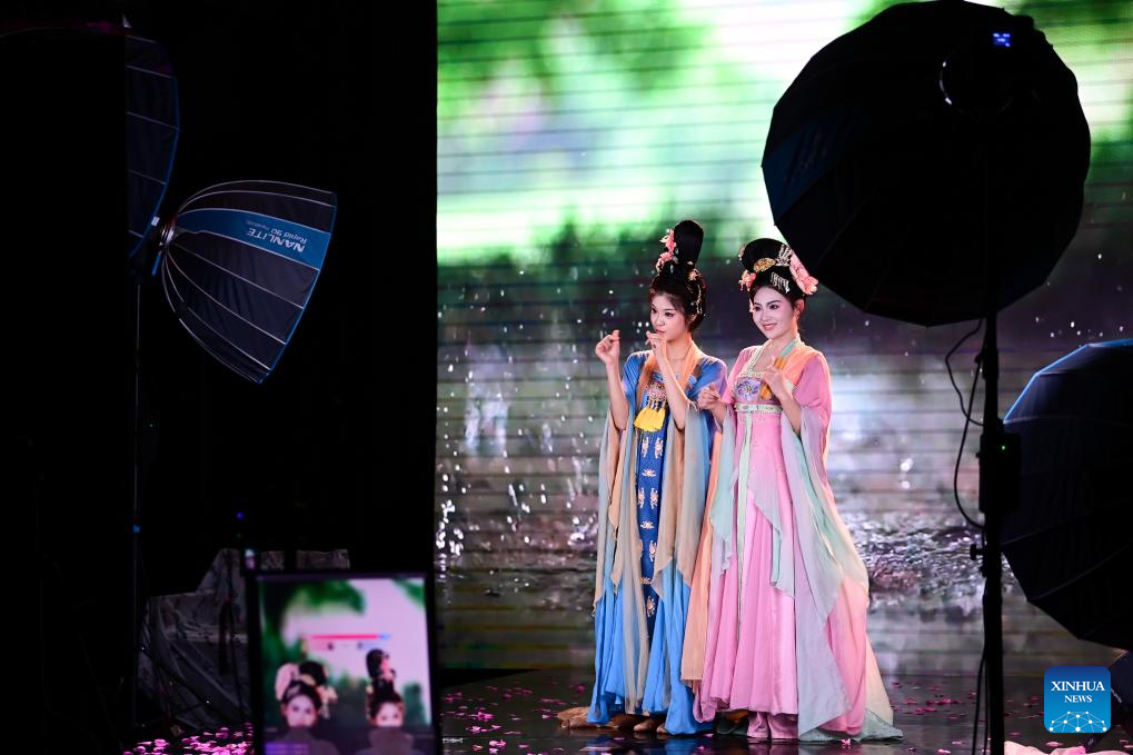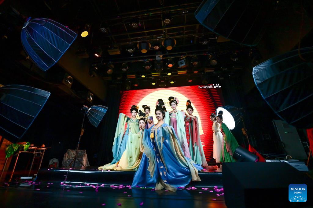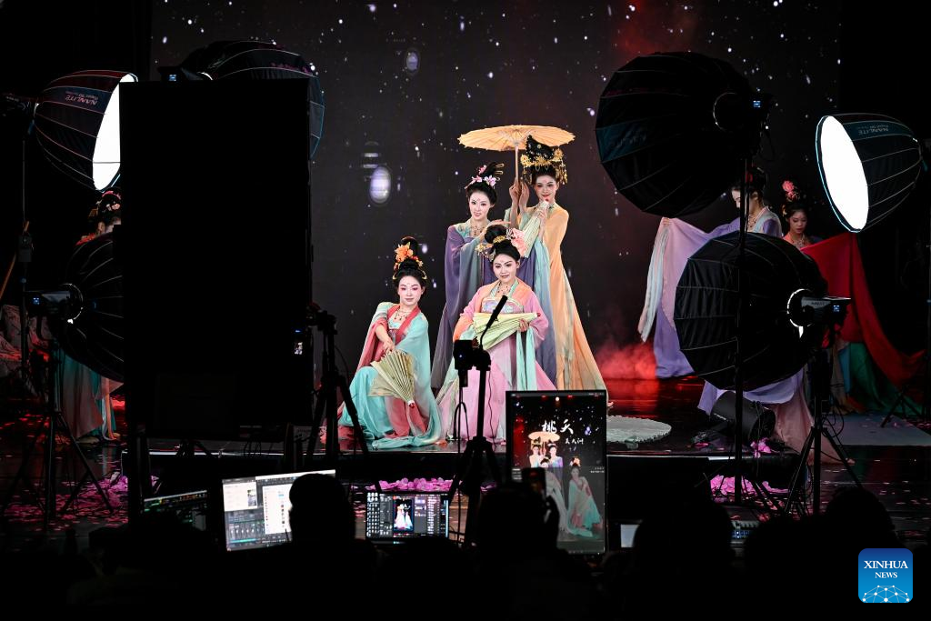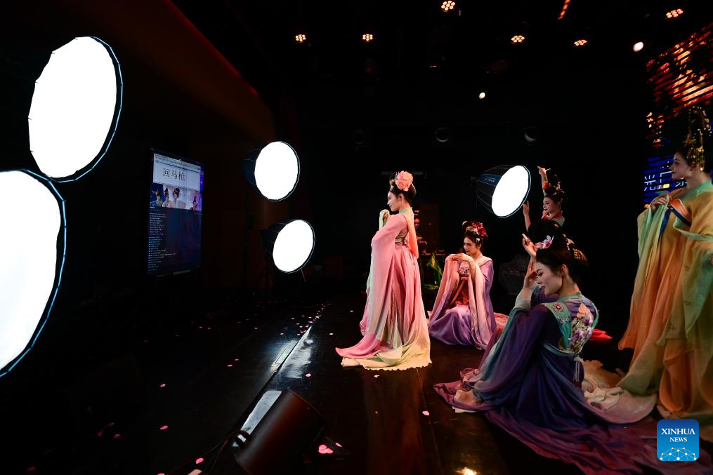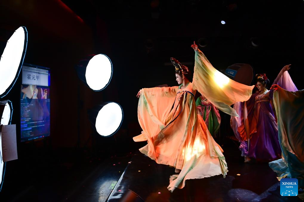 Actresses perform during a livestream in Xi'an, northwest China's Shanxi Province, Dec. 25, 2025. At the Shanxi Provincial Song and Dance Troupe, "group livestreaming" -- a new format featuring multi-performer live broadcasts -- is becoming a fresh approach for professional art troupes to explore an online "second stage" and promote the innovative expression of traditional culture.