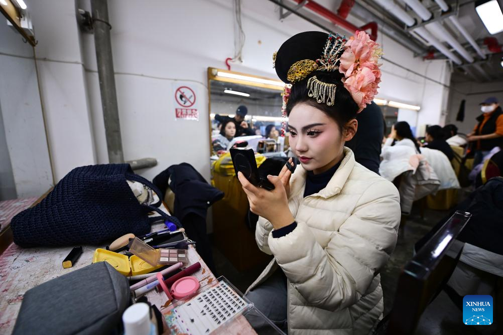 An actress applies makeup before a livestream in Xi'an, northwest China's Shanxi Province, Jan. 15, 2026. At the Shanxi Provincial Song and Dance Troupe, "group livestreaming" -- a new format featuring multi-performer live broadcasts -- is becoming a fresh approach for professional art troupes to explore an online "second stage" and promote the innovative expression of traditional culture.