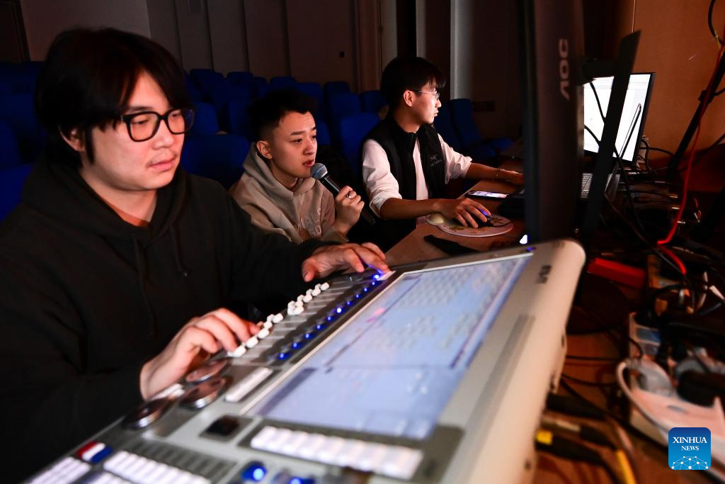 Staff members adjust the light and interact with viewers during a livestreaming in Xi'an, northwest China's Shanxi Province, Jan. 15, 2026. At the Shanxi Provincial Song and Dance Troupe, "group livestreaming" -- a new format featuring multi-performer live broadcasts -- is becoming a fresh approach for professional art troupes to explore an online "second stage" and promote the innovative expression of traditional culture.