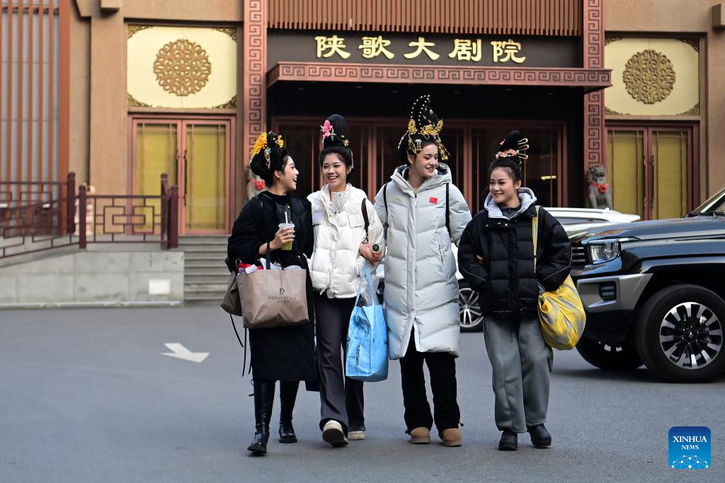 Actresses walk to their livestream studio in Xi'an, northwest China's Shanxi Province, Jan. 15, 2026. At the Shanxi Provincial Song and Dance Troupe, "group livestreaming" -- a new format featuring multi-performer live broadcasts -- is becoming a fresh approach for professional art troupes to explore an online "second stage" and promote the innovative expression of traditional culture.