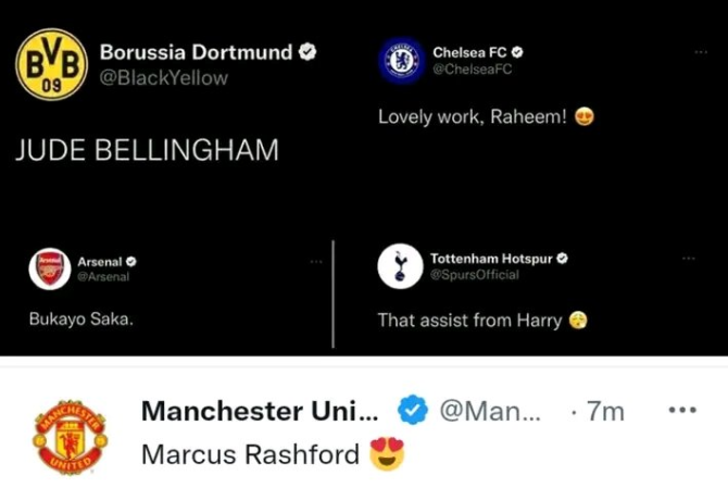 由于英格兰队这场比赛进球的球员太多,各家豪门在社交媒体上旗帜鲜明地支持自己的球星。
