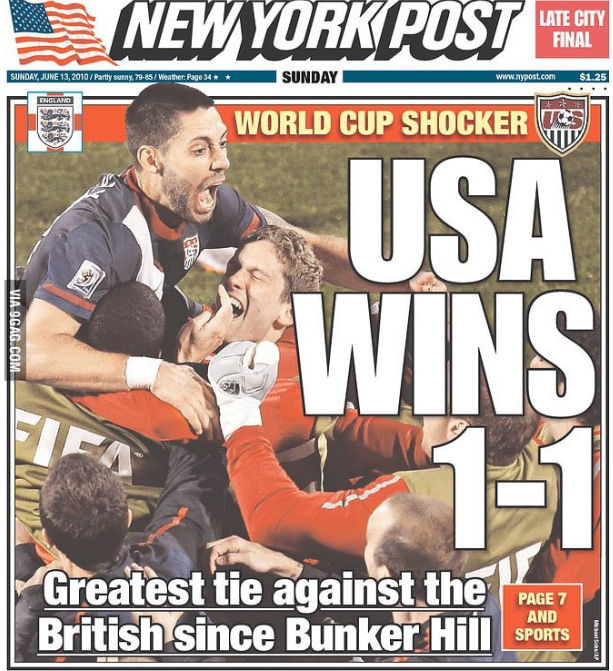 这一比赛最后阶段的进球让美国媒体慌忙为头版头条修改比分,美国队就这样以1比1战胜了对手(纯属网友恶搞):
