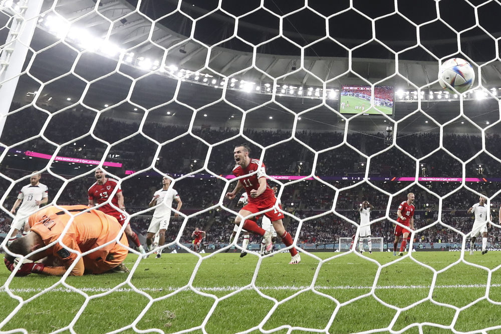11月21日,威尔士队球员贝尔(中)在比赛中庆祝点球破门。新华社记者潘昱龙摄