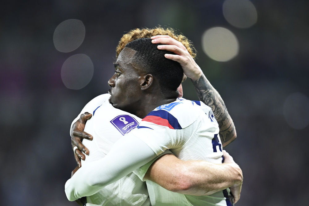 11月21日,美国队球员蒂莫西·维阿(右)与队友庆祝进球。新华社记者肖艺九摄