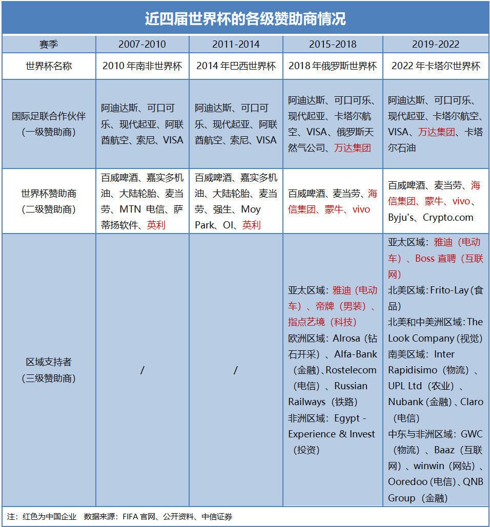 根据GlobalData公布的数据,在今年的卡塔尔世界杯上,中国企业成为本届世界杯最大赞助商,为卡塔尔世界杯赞助了共13.95亿美元,超过了美国的11亿美元。共有四家中国企业入选官方赞助商名单:万达集团、海信集团、蒙牛乳业、vivo。