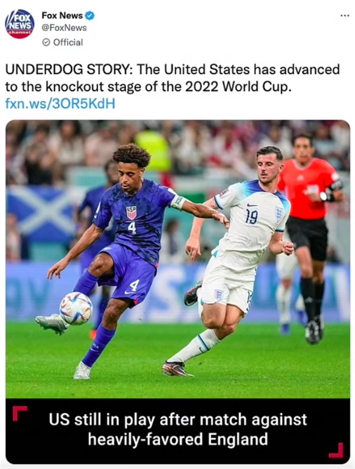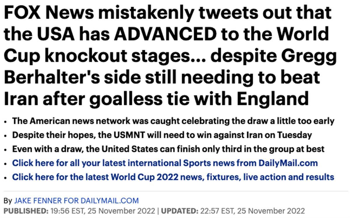 福克斯新闻在一条推文中错误地称美国队已晋级世界杯淘汰赛(图片来源:《每日邮报》)