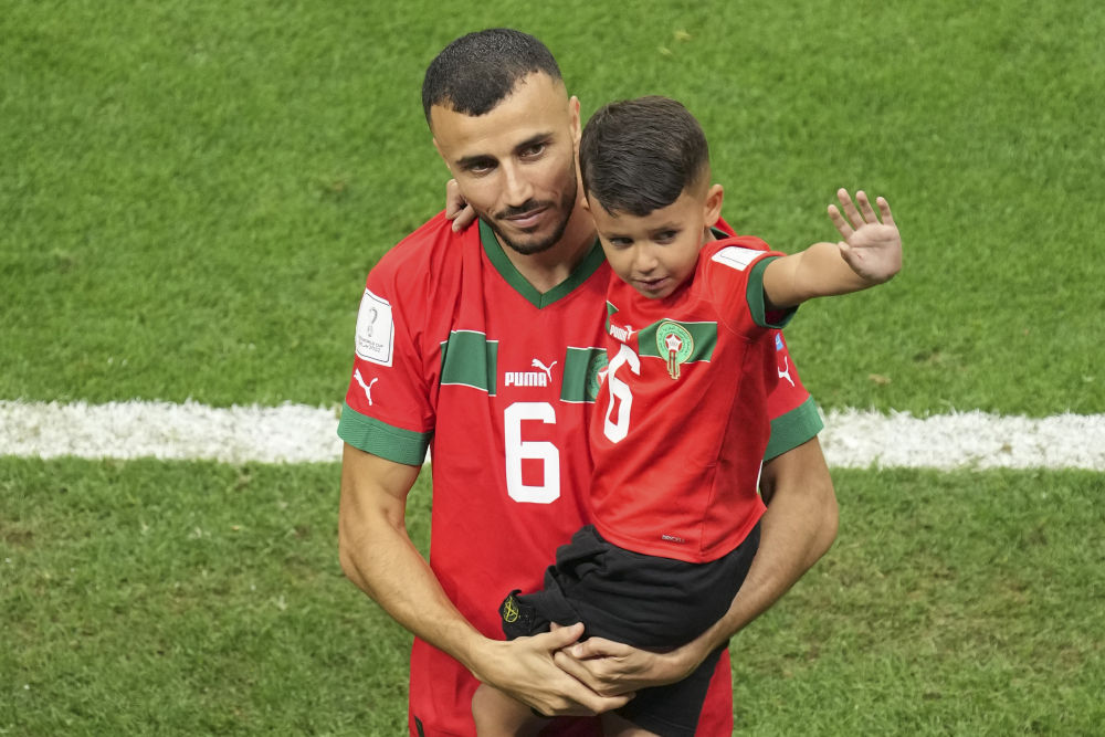 12月14日,摩洛哥队球员赛斯(左)与孩子在比赛后。新华社记者肖艺九摄
