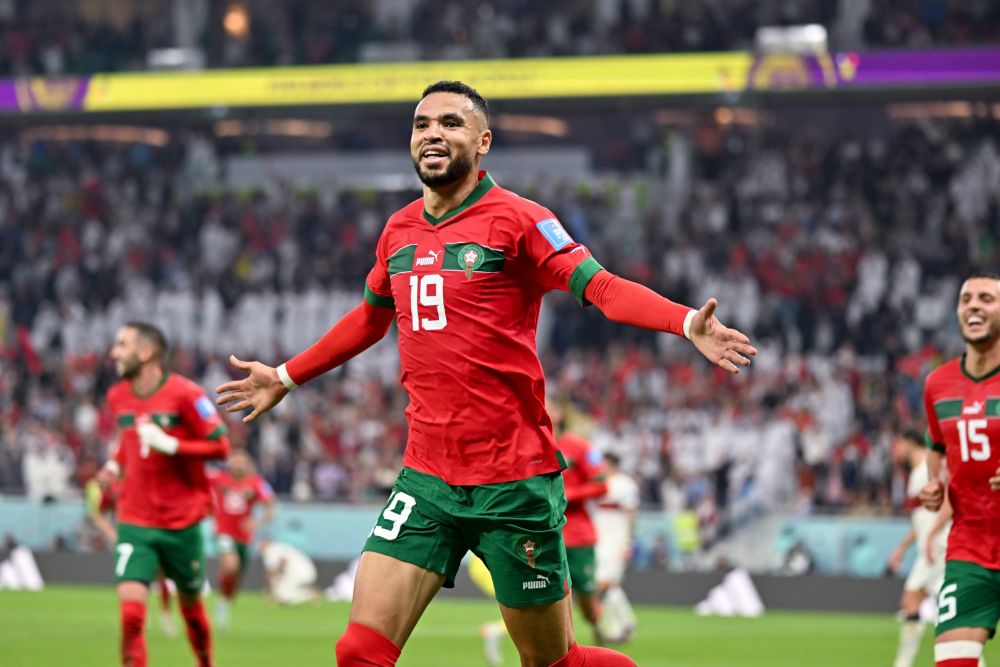 12月10日,摩洛哥队球员恩内斯里(前)在比赛中进球后庆祝。新华社记者肖艺九摄