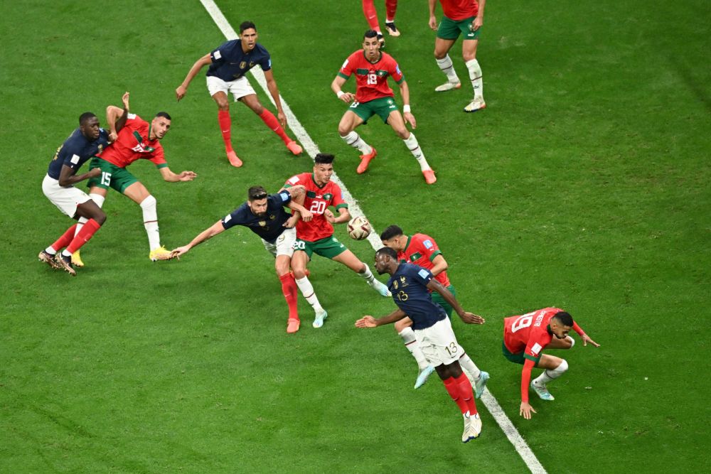 12月14日,法国队球员福法纳(下右三)与摩洛哥队球员阿什拉夫(下右二)在比赛中争顶。新华社记者肖艺九摄