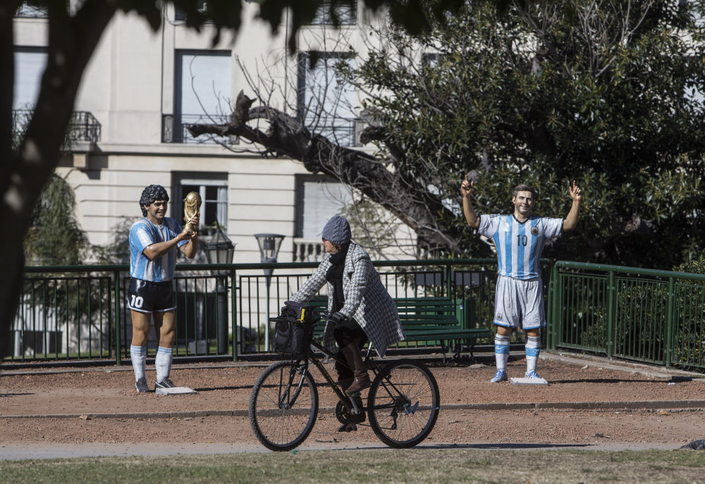 2014年6月19日,阿根廷布宜诺斯艾利斯阿尔韦亚尔市长广场展出马拉多纳(左)和梅西的雕像。新华社发(马丁·萨巴拉摄)