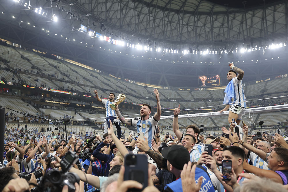 12月18日,梅西(上中)在颁奖仪式后手捧大力神杯庆祝。新华社记者曹灿摄