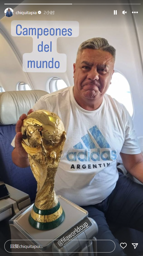 海外网12月19日电在当地时间18日举行的卡塔尔世界杯决赛中,阿根廷队在点球大战中战胜法国队夺得冠军。赛后,阿根廷足协主席塔皮亚在社交平台“照片墙”上晒出自己带着大力神杯坐飞机回国的照片,并配上了“世界冠军”的文字。