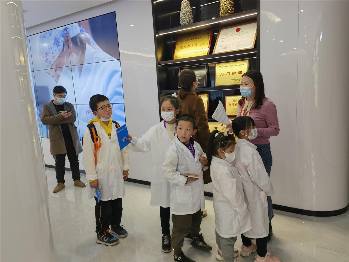 随后,小记者们在爱齿尔余老师的带领下,参观了爱齿尔口腔中南院区。面对展示墙上的机构认证和荣誉锦旗,余老师告诉大家,做任何一个职业都需要专业的技术能力和高尚的职业品格,她鼓励孩子们努力学习,未来努力实现自己的理想。