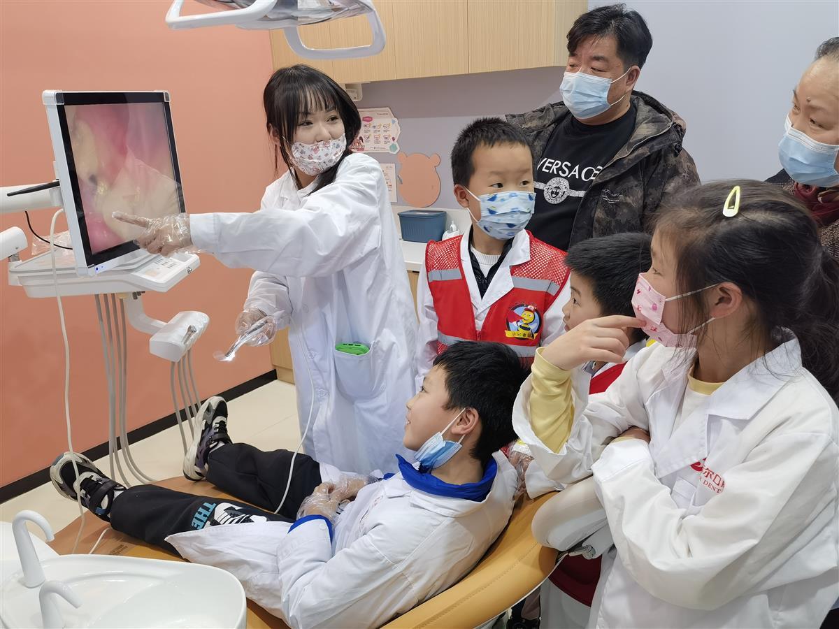 最后,到了最令人期待的环节!小记者们穿上白大褂,正式“上岗”啦!娟娟老师和牙科主任首先向他们介绍了口腔治疗椅和镊子、探针、内窥镜等治疗器械。在医生指导下,小牙医亲自上手,用内窥镜互相检查牙齿或者给自己的爸爸妈妈检查牙齿。通过视频,他们可以清楚地观察到口腔情况,甚至还在小伙伴嘴里找到了龋齿,真是太厉害了!