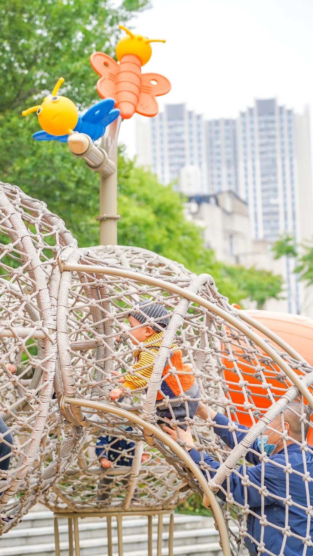 公园有两颗外观奇特的镂空奇趣蛋,内里藏着攀爬网、蹦床等可以让小朋友强身健体的运动设施。