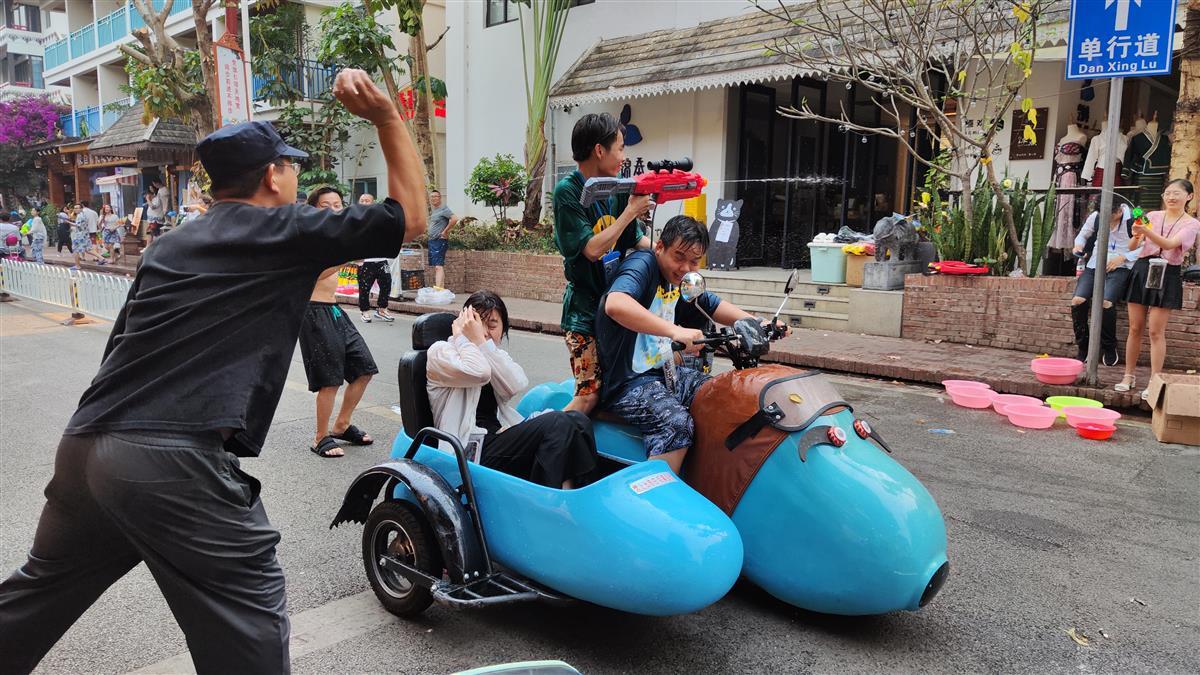 4月12日下午,极目新闻记者在西双版纳告庄西双景景区看到,虽然泼水节活动还未正式开始,但当地街头已有浓浓的节日氛围,不少年轻人手持水枪或单人作战,或组队行动,时不时对路人发起一阵“狂轰乱炸”。