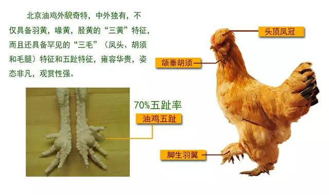 古语云:“五爪为凤,四爪为鸡”,但北京油鸡却独有五根脚趾!鸡冠挺立似为凤头、天然胡子嘴、脚生羽翼,看起来就像是鸡中的贵族。北京油鸡以其繁殖性能优、抗病力和适应性强、肉质鲜美等特点闻名于世。