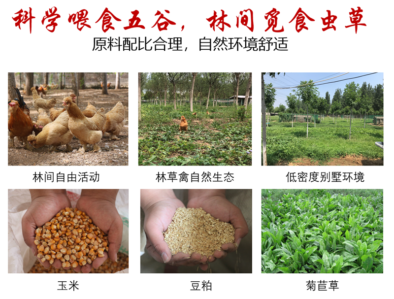 北京油鸡生活在树林下,生态放养是它们的主要生活方式,可以说是享受着‘五星级福利待遇’,林下一亩地约放养100只油鸡,除了吃林下的菊苣和小虫外,还要及时补充优质玉米、豆粕和高蛋白黄粉虫等。