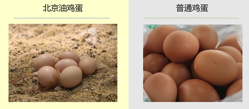 (2)比例、重量:北京油鸡蛋的蛋黄比例平均在33%,重量在17克左右;而普通鸡蛋的蛋黄也是17克左右,蛋黄比例却是25%左右。