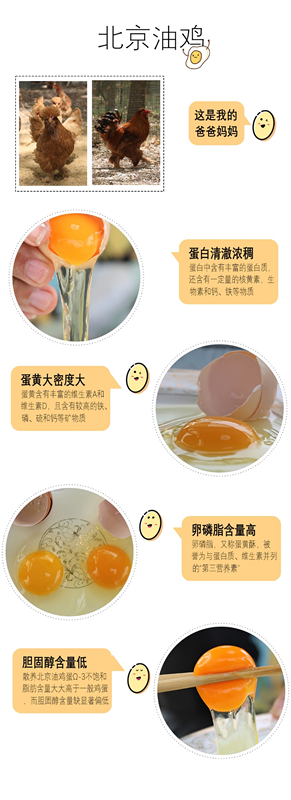 口味纯正、气味清香,即便是简单的煮鸡蛋,也能发挥出优良的口感,因此,营养价值极高的北京油鸡蛋,也成为孕妇、孩子和老人的首选。
