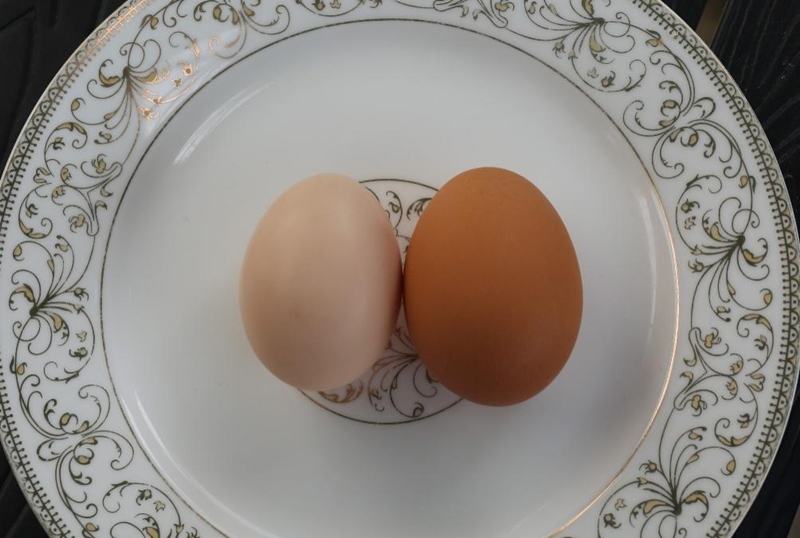 左边的是北京油鸡蛋,右边为普通红壳鸡蛋
