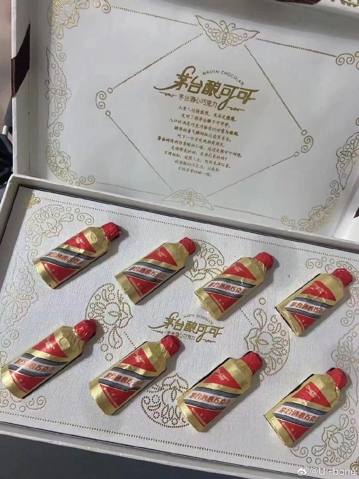 9月13日晚,贵州茅台官微发布“贵州茅台×?9月16日,敬请期待~”的消息。配图除了茅台酒瓶,右上角是一个红色蝴蝶结图案,配文“入口即化回味悠长”。当晚,有报道指出,茅台即将发布酒心巧克力产品,合作方为玛氏食品旗下的德芙巧克力。