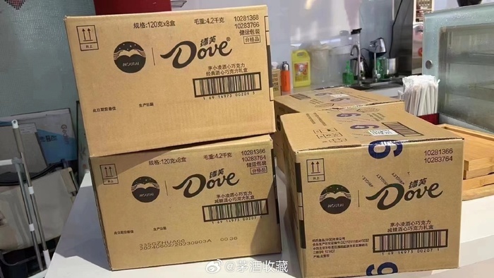 当晚另一组广为流传的图片显示,牛皮色纸箱上有贵州茅台和德芙logo,产品名为“茅小凌酒心巧克力减糖酒心巧克力礼盒”,规格为120克*8盒,毛重4.2千克,生产日期为2023年9月3日00:36,2024年4月2日前最佳。至少4个同样的箱子被放置在一张白色桌子上,背景有疑似吸管、餐洗净和水槽等物品。目前无法判断这组图片的真伪,有人调侃,这次的保密工作做得不够好。