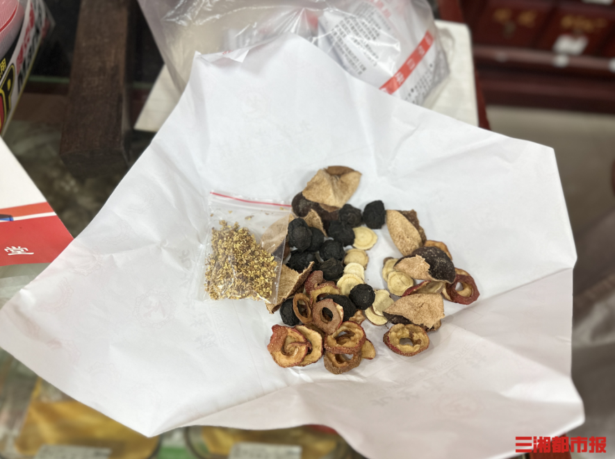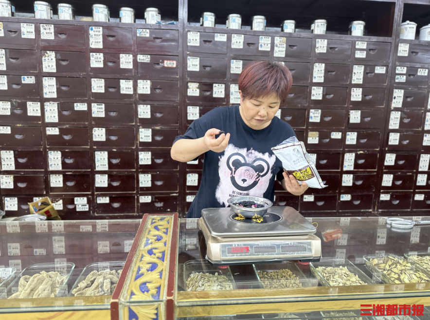桑葚20克、玫瑰12克、乌梅30克、山楂20克、陈皮和甘草各5克……9月13日,长沙飘起毛毛细雨,在开福区蔡锷路的千金大药房内,店员罗女士嘴里嘀咕着“酸梅汤”的药材克重数,从背后的中药斗柜中取出对应的药材,放上称重称。