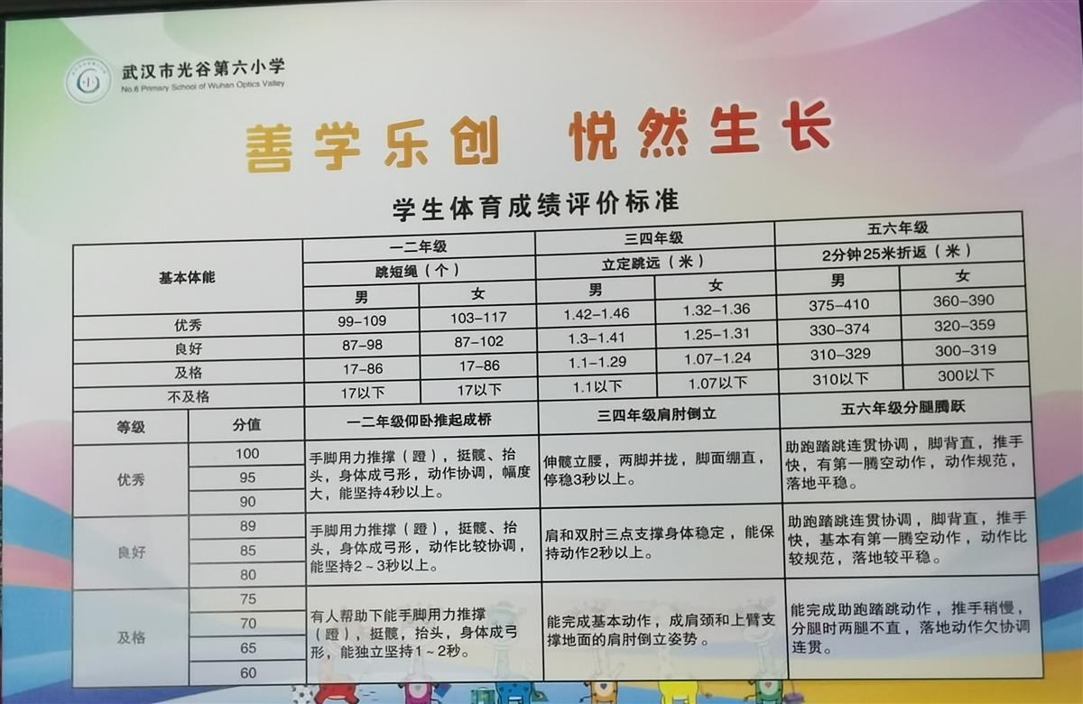 “我校是湖北省体育局体教融合示范校、湖北省体操传统项目学校,多年贯彻‘体育是第一学科,运动是第一要事’方针,一至三年级每周每班开一节体操课。申报湖北省教育科学‘十四五’规划重点课题《体教融合背景下‘一体化’推进校园体操路径研究》后,我们通过三年的数据分析发现,学生体质健康水平全面提升,以体树人成效明显,今年便适时推出体育成绩单。成绩单不与师生考核挂钩,只为帮学生养成终身运动习惯,提醒所有老师更重视体育。”光谷六小校长李明菊说,今后,学校每学期末都会做体育等级考评。