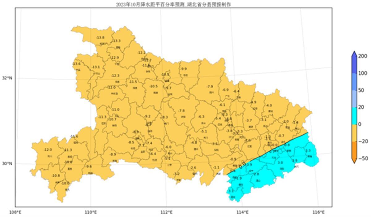 湖北省各县市2023年10月降水距平百分率预测图(%)