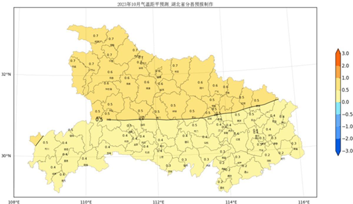 湖北省各县市2023年10月气温距平预测图(℃)