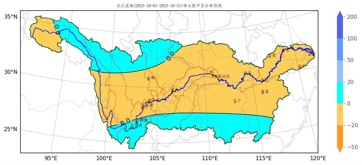 长江流域2023年10月降水距平百分率预测图(%)