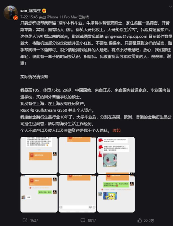 在走红后,有网友发布了徐勤根的个人信息:“徐勤根,身高185cm,29岁,清华本科毕业,牛津普林普顿双硕士,金融学高级知识分子,月入七位数,一身行头加起来超过六位数,两套汤臣一品,开劳斯莱斯,宾利,拥有私人飞机。”