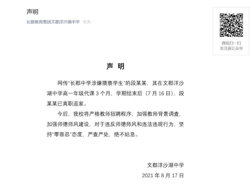 17日上午,文郡洋沙湖中学发表声明称,网传“长郡中学涉嫌猥亵学生”的段某某,其在文郡洋沙湖中学高一年级代课3个月,学期结束后(7月16日),段某某已离职返家。