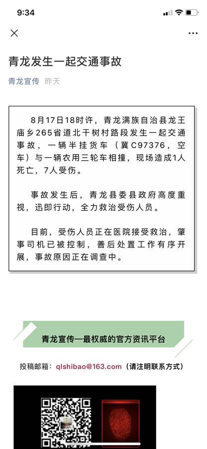 对此,河北秦皇岛市青龙县宣传部发布通报称,当日18时许,青龙满族自治县龙王庙乡265省道北干树村路段发生一起交通事故,一辆半挂货车(冀C97376,空车)与一辆农用三轮车相撞,现场造成1人死亡,7人受伤。