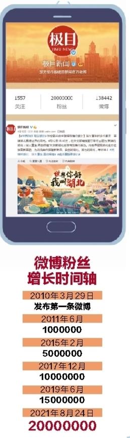 步履铿锵,星辰为证。2010年3月,楚天都市报官方微博正式开通;2017年12月,微博粉丝突破1000万;2021年8月,微博粉丝跨过2000万——从1到1000万,用了7年多;从1000万到2000万,用时不到4年。