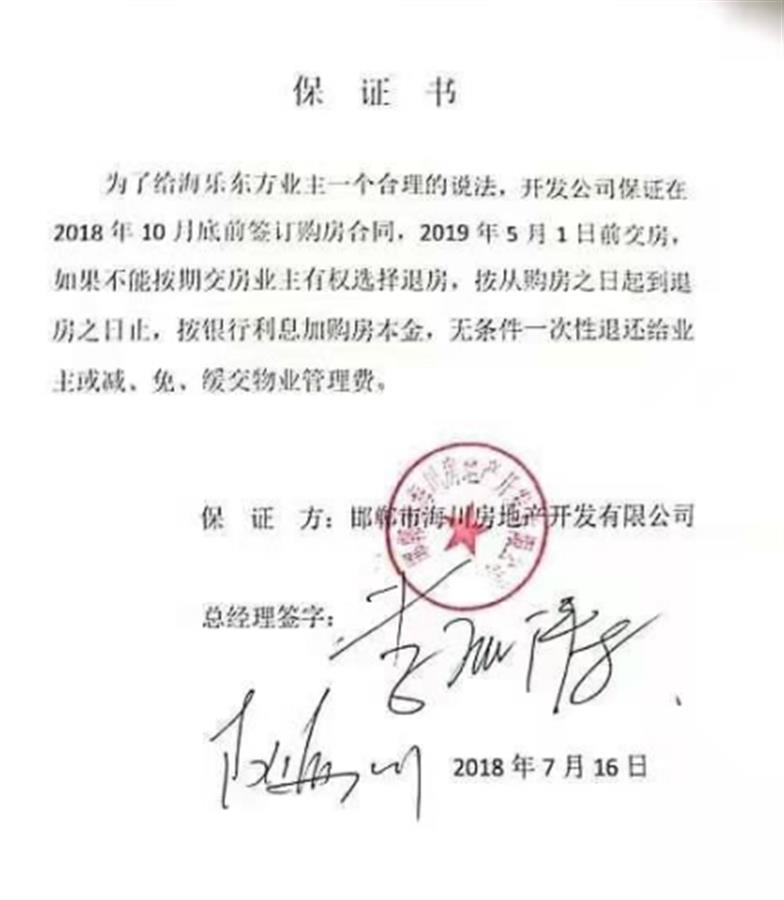 多位业主告诉极目新闻记者,他们曾多次单独或集体向相关部门反映房子迟迟未交付的问题,相关部门督促开发商写保证书。业主提供的一张图片显示,早在2018年7月,小区开发商邯郸市海川房地产开发有限公司曾保证称,2018年10月底前签订购房合同,2019年5月1日前交房。